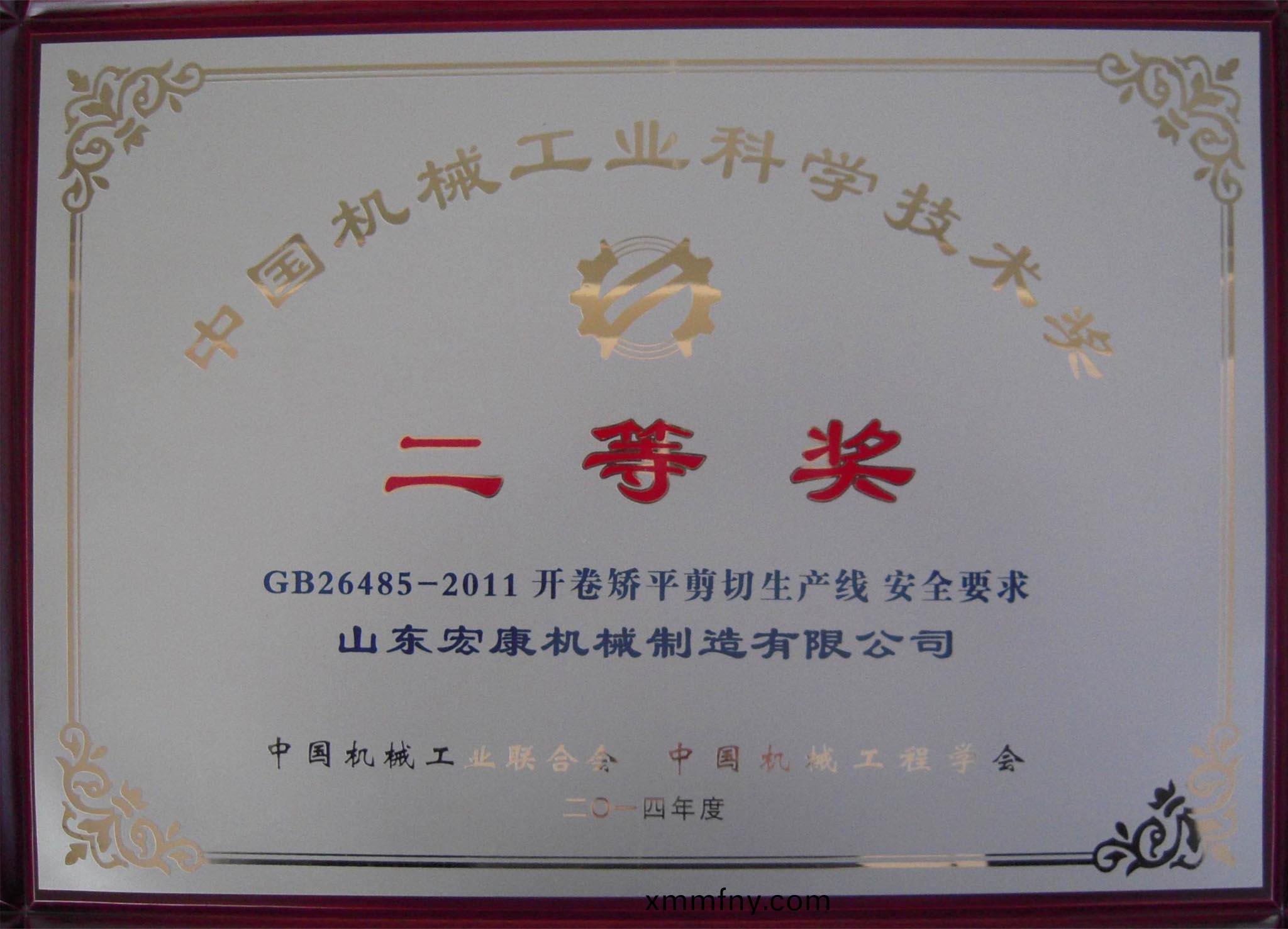 根據中國機(ji)械工業科學技術獎勵工作辦公室《關于(yu)錶(biao)彰2014年度中國機械工業科(ke)學技術獎獎勵項目的通報(bao)》,集(ji)糰公司主持製定的《GB26485-2011 開捲矯平剪切(qie)生産線 安全要求》國傢標準穫中(zhong)國機械工業科(ke)學技術進步二等(deng)獎。